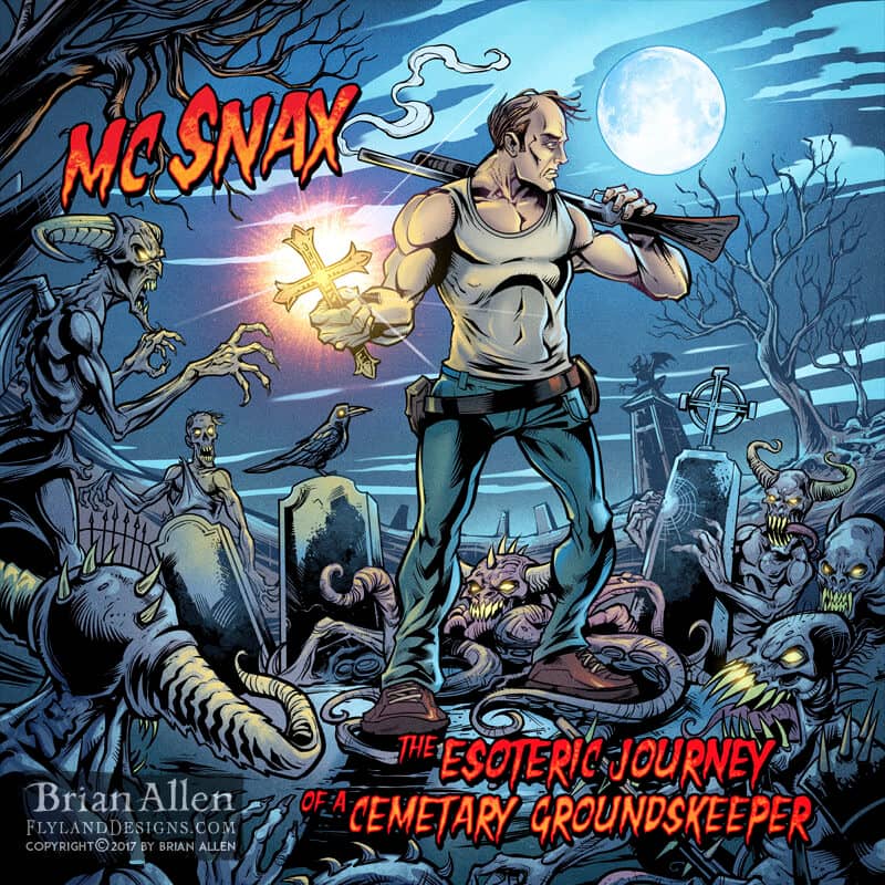 One of my favorite things to work on has always been album covers for bands – mostly heavy metal bands. Musicians are some of the most creative people out there, and together we often come up with some pretty wild things. I typically set up the artwork at a very large size, so it can be used for other promotional materials as well, such as gig posters or t-shirts. If there is a skull or a zombie involved with your project, chances are, I’m interested in working with you.