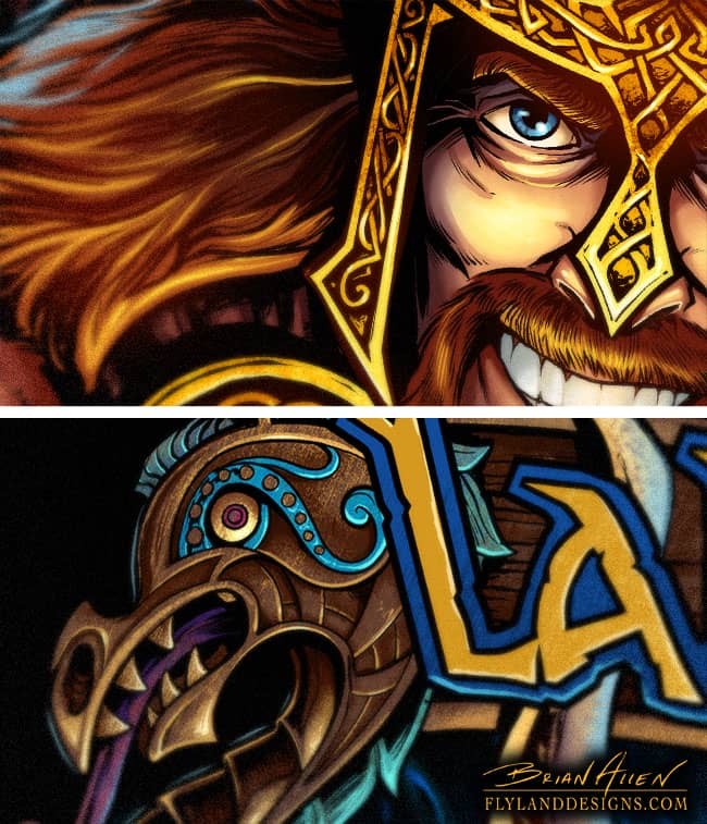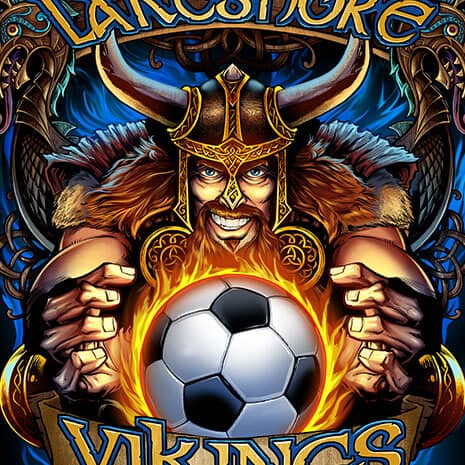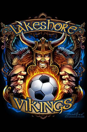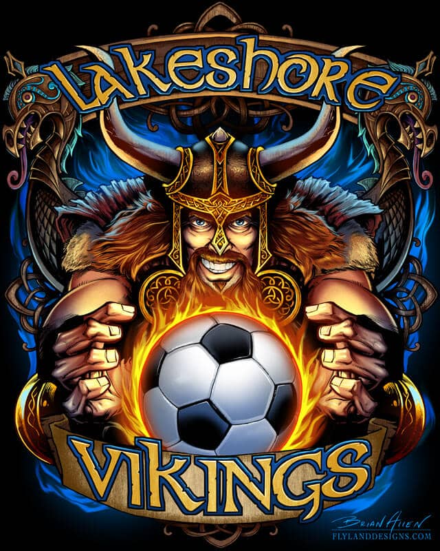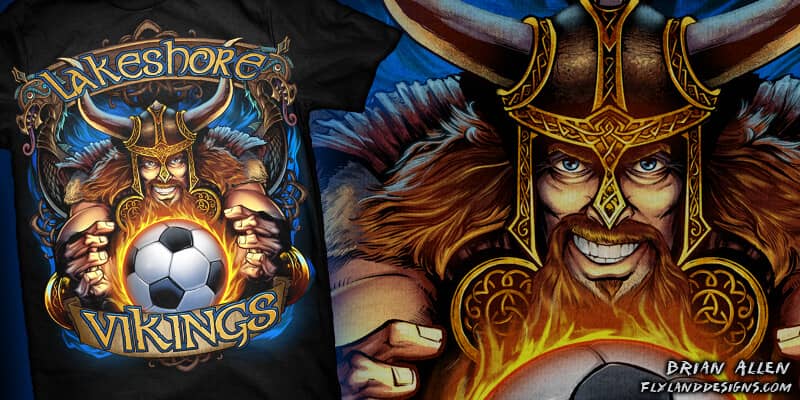 This is an illustration I created of a viking mascot for a soccer team shirt. The artwork was set up for direct to garment, which allowed me to really go nuts with the color variations and detail. Created for Great Dane Graphics.com.