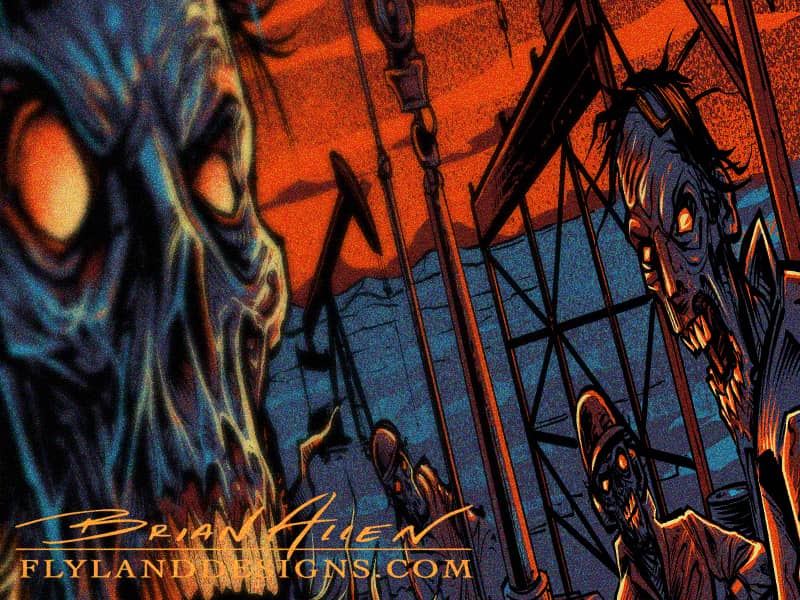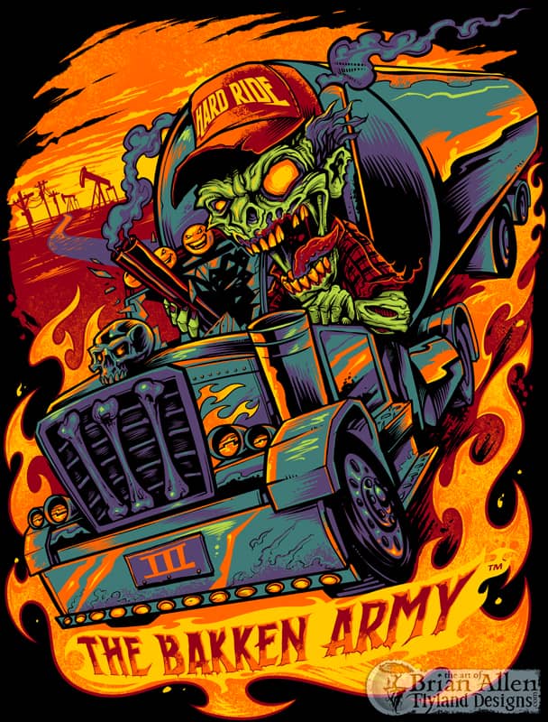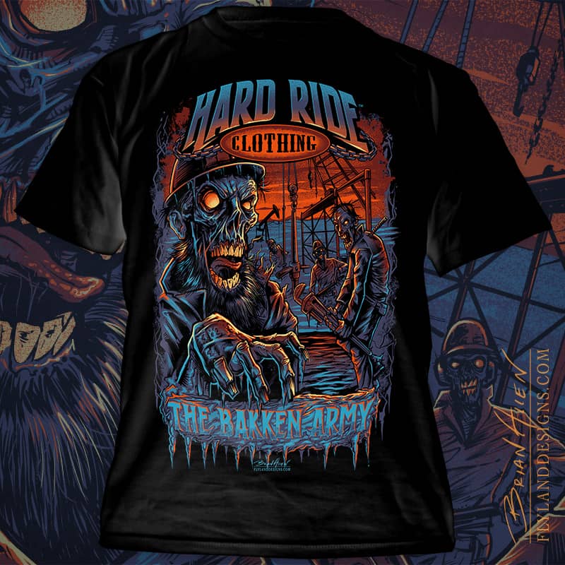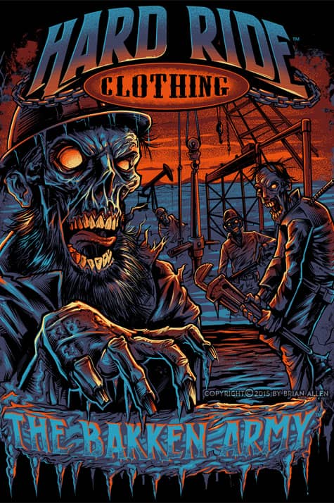 T-Shirt illustration I created for Hard Ride Clothing. The client wanted something creepy that would appeal to truckers and oil workers in his market. I designed this zombie-infested Bakken oil field design for silk-screening, using four colors.