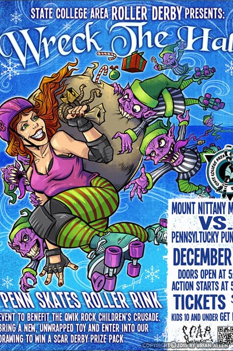 Roller Derby poster I created for the State College Area Roller Derby organization. A roller derby girl makes off with santa’s bag, while monster elves dressed as referees chase after her. You know, for Christmas.