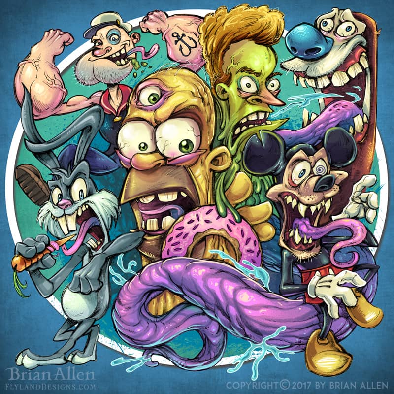 Here is a collection of my humorous parodies, and other fan art. I love bringing a sense of humor to my artwork, even when the subject matter is dark. Growing up in the 80’s, I’m also a huge fan of retro video games, ridiculous toys, cheesey hair-metal, and 80’s and 90’s horror movies and comedies. A lot of my artwork style is influenced by hyper-detailed (and sometimes gross) illustrations like those on Mars Attacks, and Garbage Pail Kids trading cards. I was always a big fan of the detailed illustrations on heavy metal album covers, like Iron Maiden, Dio, and especially an album by Black Sabbath called “Dehumanizer.”