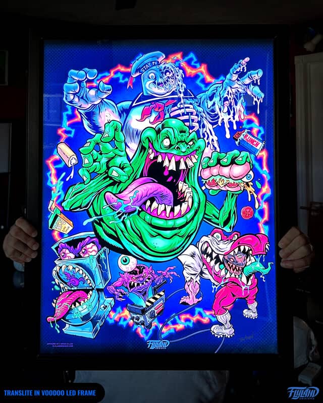 Cartoon parody illustration of Slimer, Stay Puft Marshmallow Man, and other ghots from the Ghostbusters cartoon drawn by Artist Brian Allen