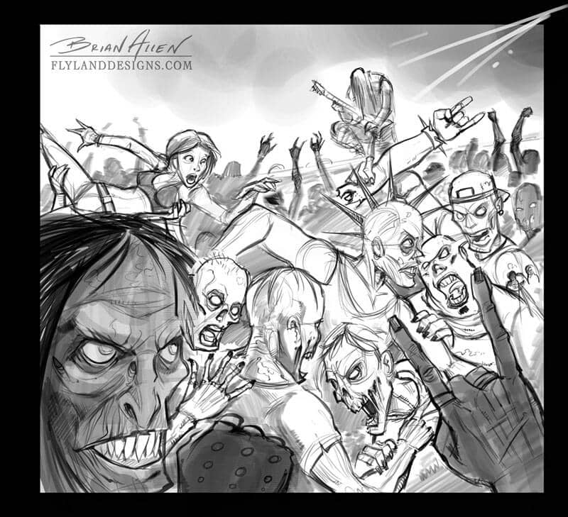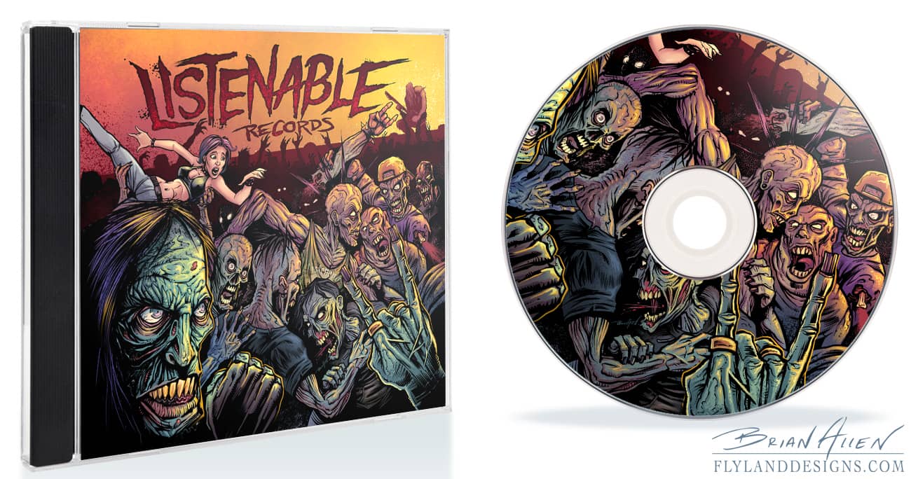 Album cover I illustrated for a new promotional album for Listenable Records. My client came up with the idea of having a moshpit of metal zombies rocking out. I thought it would be funny to put a frightened goth chick crowd-surfing to her doom. The illustration was created at a huge size so that it could also be displayed as a four foot banner at concerts. Iron Maiden Tribute Cover: Iron Maiden, and the artist behind their amazing artwork, Derek Riggs, have always been a huge inspiration for everything that I do. So I was super excited when I was hired by Listenable Records to create an illustration tribute to Iron Maiden’s first album, “Killers,” for an upcoming sampler that would be given out at Iron Maiden concerts in Europe. I tried to cram in as much of my own style as I could.