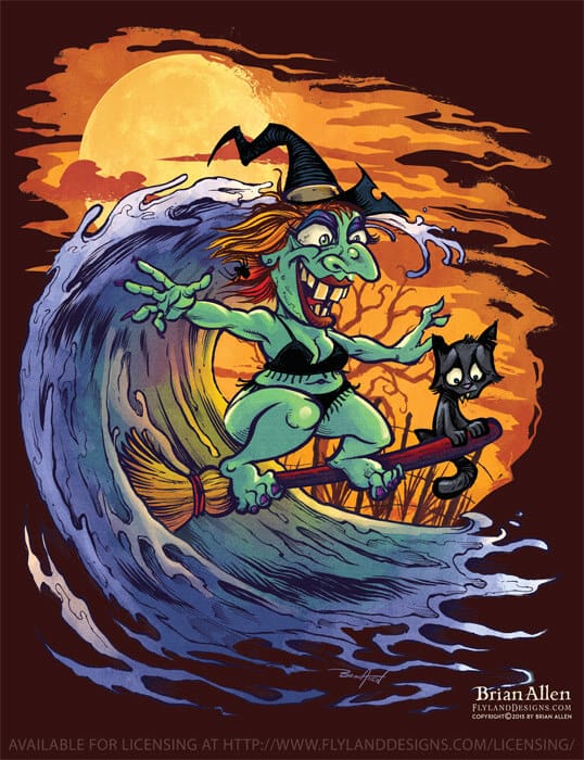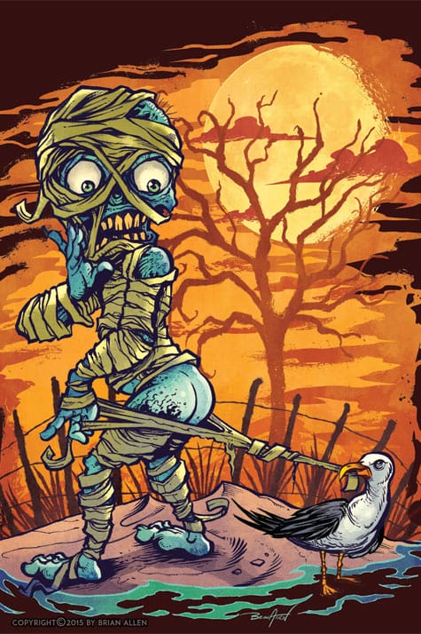 I created this series of four halloween illustrations of classic movie monsters vacationing at the beach for a Halloween festival I attended. I drew a witch surfing a wave on her broomstick, a kid building a sandcastle on top of a buried zombie, a vampire getting a moon-tan, and a mummy being unravelled by a seagull exposing a little mummy butt. I tried to keep the theme and layout from piece to piece consistent, while using a Fall Halloween color scheme.