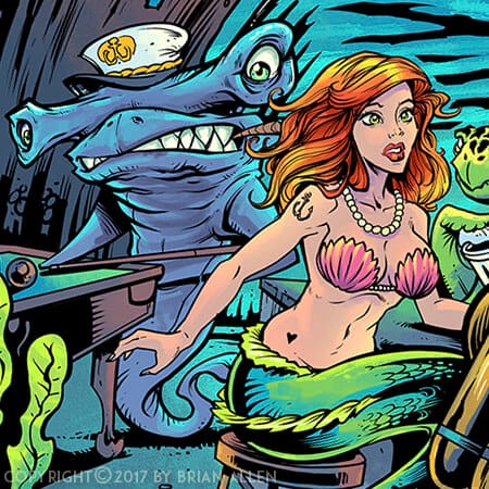 Client: Great Lakes Description: T-shirt illustration I created for Great Lakes Graphics featuring a dive bar home to shady looking sharks, slutty mermaids, and deep-sea diving gorillas. The design is black and white on the shirt until the wearer goes out into the sun, and the colors are revealed! Client Testimonial: Wouldn’t change a thing, looks great! -Matt Whelpton Owner, Great Lakes