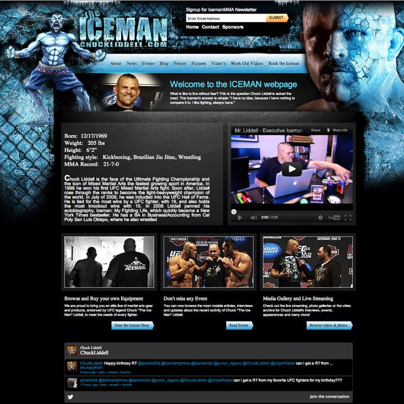 I had the privilege of working with UFC legend, Chuck Liddell’s marketing team to create the graphics and illustration for his official website. Nicknamed The Iceman, the natural direction was to design the site with chunks of flying ice and cool colors.