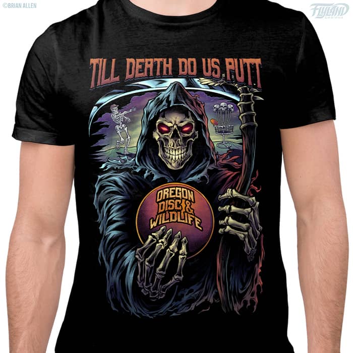 This t-shirt design is of a Grim Reaper playing disc golf with a skeleton Grim Reaper in the front of the design.